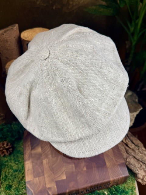 Krásná lněná bekovka ve tvaru mlynářky - má pevný kšilt, látka je rozdělena na 8 dílků a nahoře je cuplík. Její střih je volnější, látka by měla lehce přepadávat přes okraje. Díky přírodním materiálům bude velmi příjemná a doporučujeme ji tak pro jarní nebo letní sezónu.