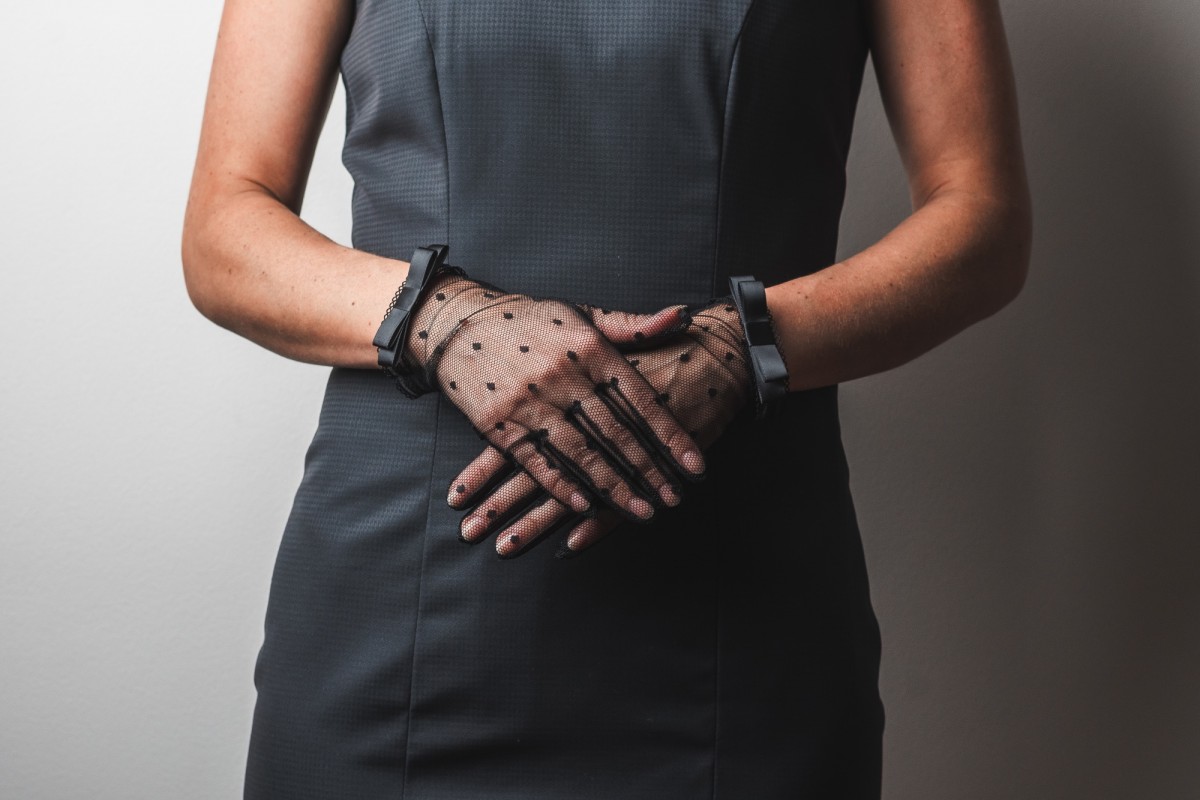 Elegantní textilní rukavice s ozdobným lemem, na kterém je decentní mašle.