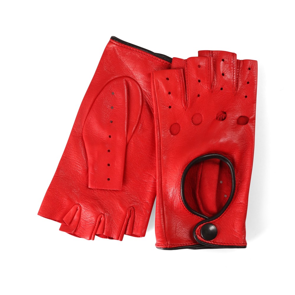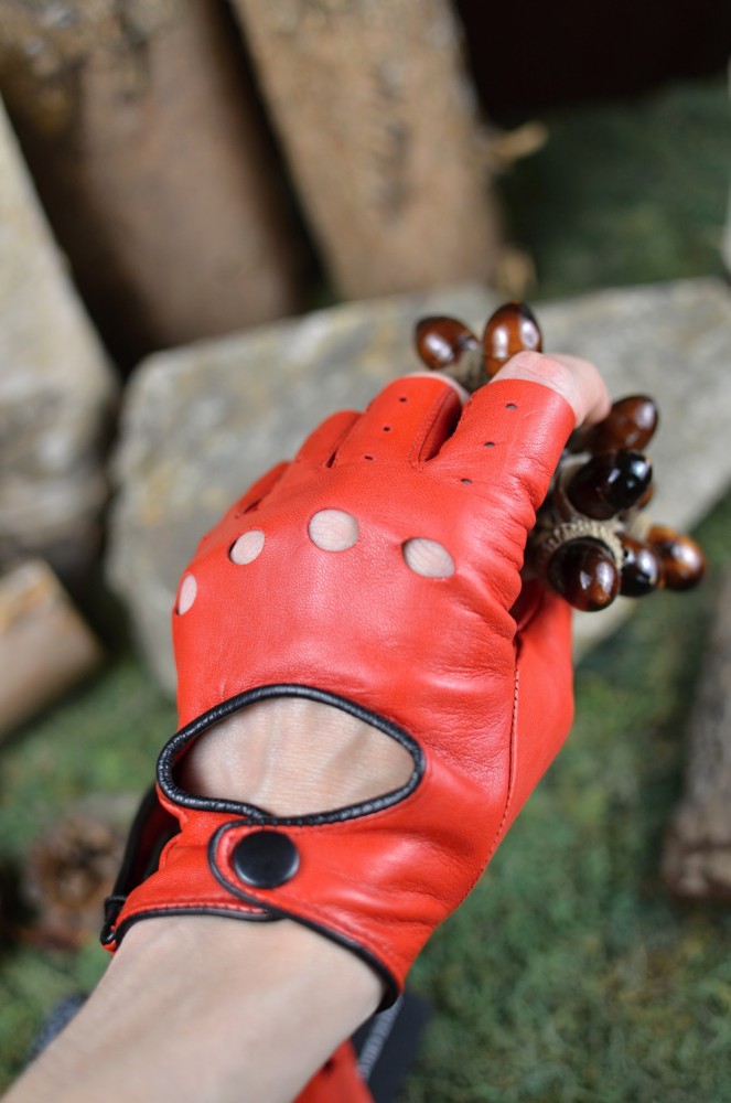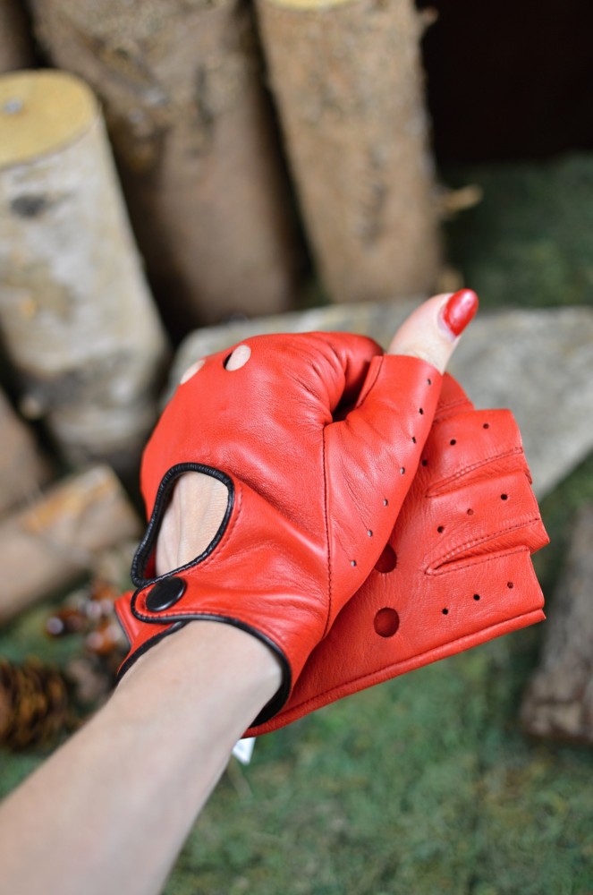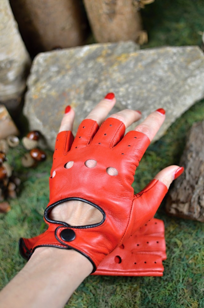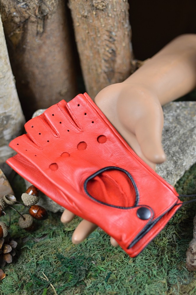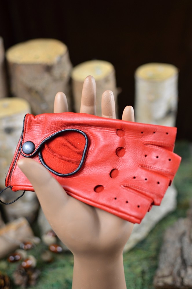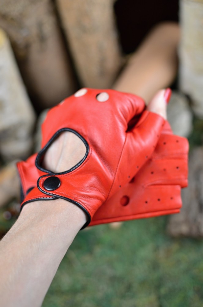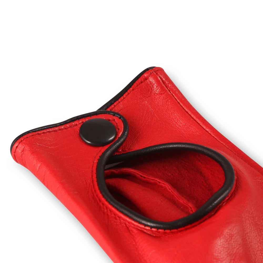 Rukavice jsou vyrobené z kvalitní jehnětiny, v červeném designu s černým lemem.