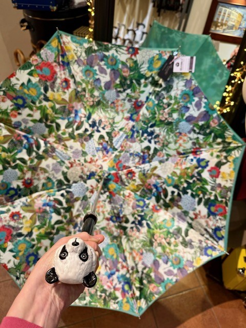 Rukojeť dešníku je dalším skvostem, dominuje jí, ručně malovaná hlava medvídka pandy v černobílém provedení. Černý čumák, černé brýle, vypadá moc roztomile, dolu si je nechce dát, protože chce dobře vypadat. Což vlastníkovi tohoto deštníku zaručuje skvělou image. :-)