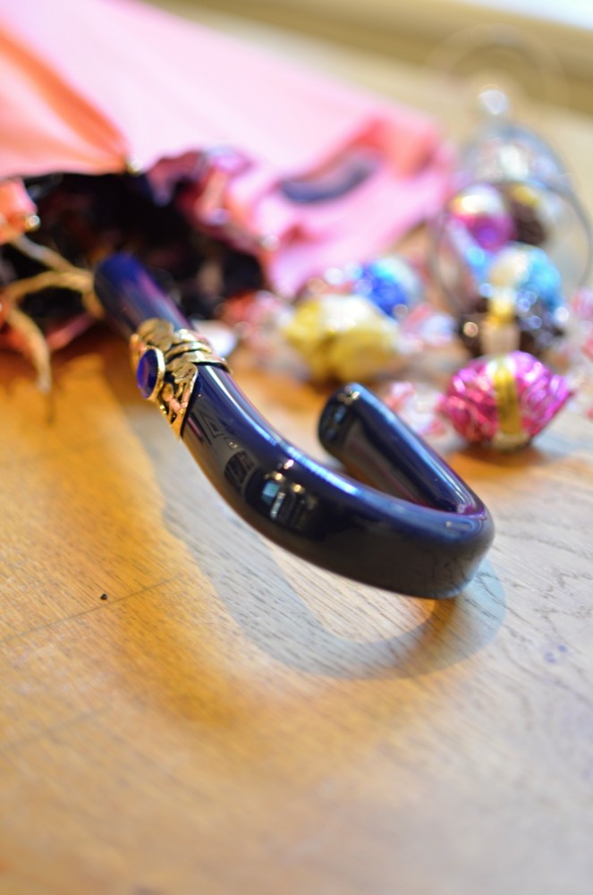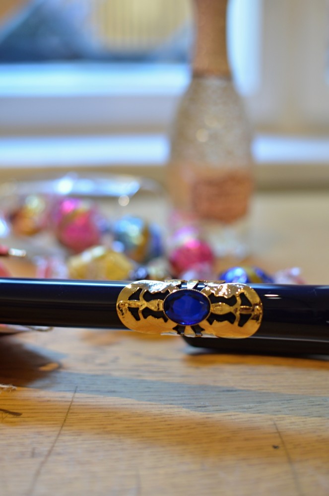 Rukojeť je tmavě modrá a zakulacená, průběžně přecházející do zlatavé barvy, je na ní i skvostný menší plíšek ve stejné zlatavé barvě, ve kterém je krásně zakomponovaný modrý kamínek.