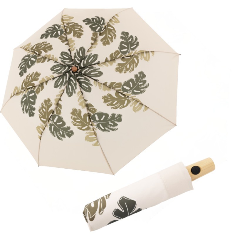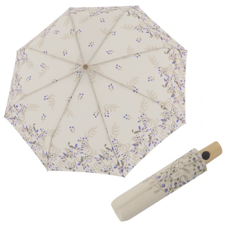 Dámský něžný plně automatický deštník do kabelky. Vyroben z EKO materiálů šetrných k životnímu prostředí. Má dřevěnou rukojeť ve světlé barvě a krásný jemný vzor.