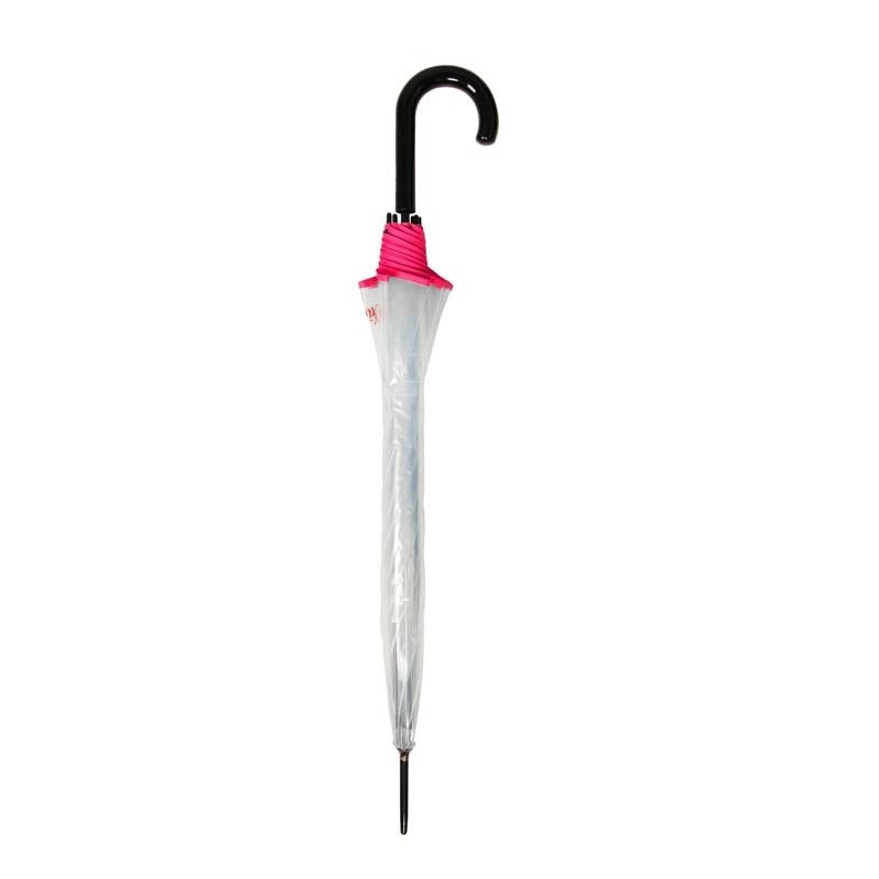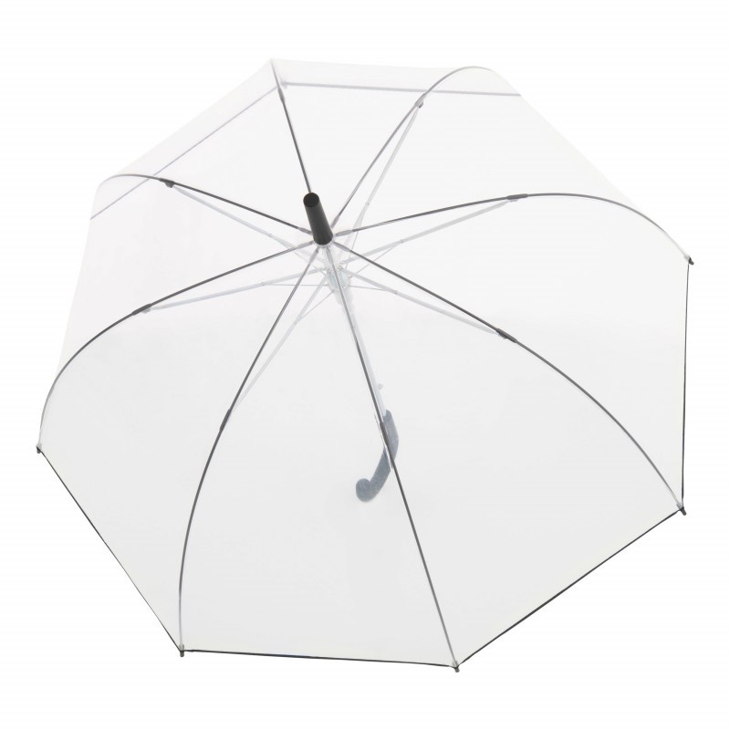 Dámský průhledný deštník je vyroben z pevného a odolného materiálu. Jeho hluboký tvar poskytuje lepší ochranu před deštěm a průhledné provedení zároveň zajišťuje dobrý výhled bez nepříjemného omezení, které bývá u běžných deštníků.