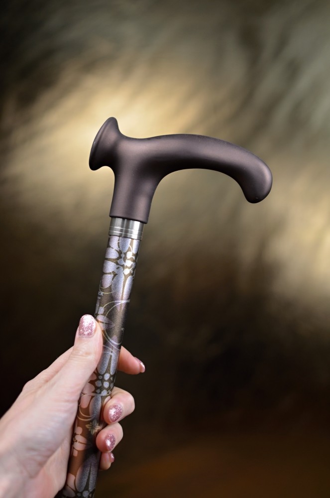 Dámská teleskopická vycházková hůl s ergonomickou rukojetí na pravou ruku.