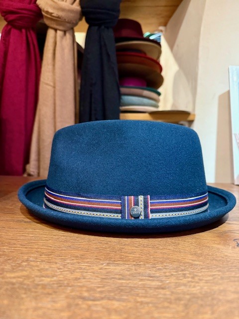Plstěný klobouk v tmavě modré barvě s ozdobnou stužkou.