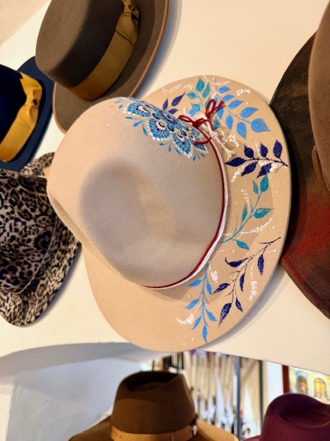 Plstěný béžový klobouk s ručně namalovanými květinovými vzory...Originální kousek vyrobený pouze pro Hůlkárnu.