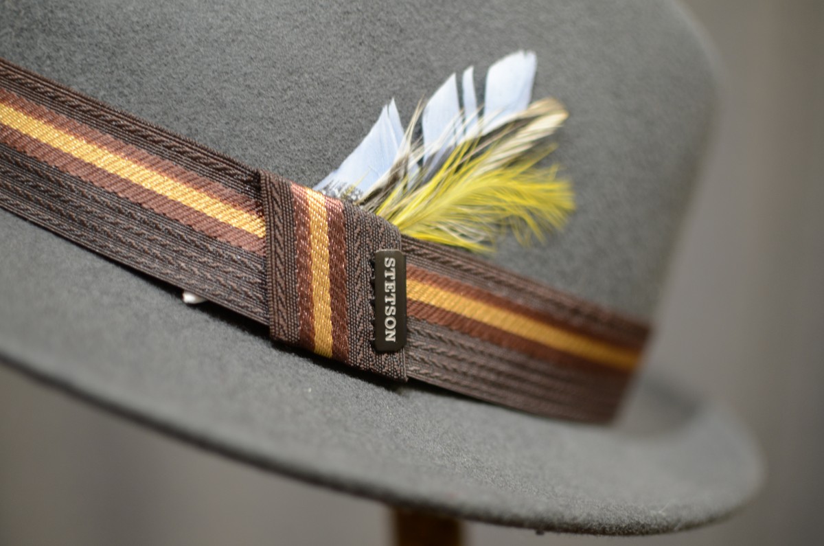 Velmi elegantní a stylový plstěný klobouk od značky Stetson jehož hlavní složkou je 100% vlna. Klobouk je ve tmavě šedé barvě s ozdobným hnědým páskem a barevnými pírky (které lze jednoduše oddělat). Samozřejmostí je potní pásek.