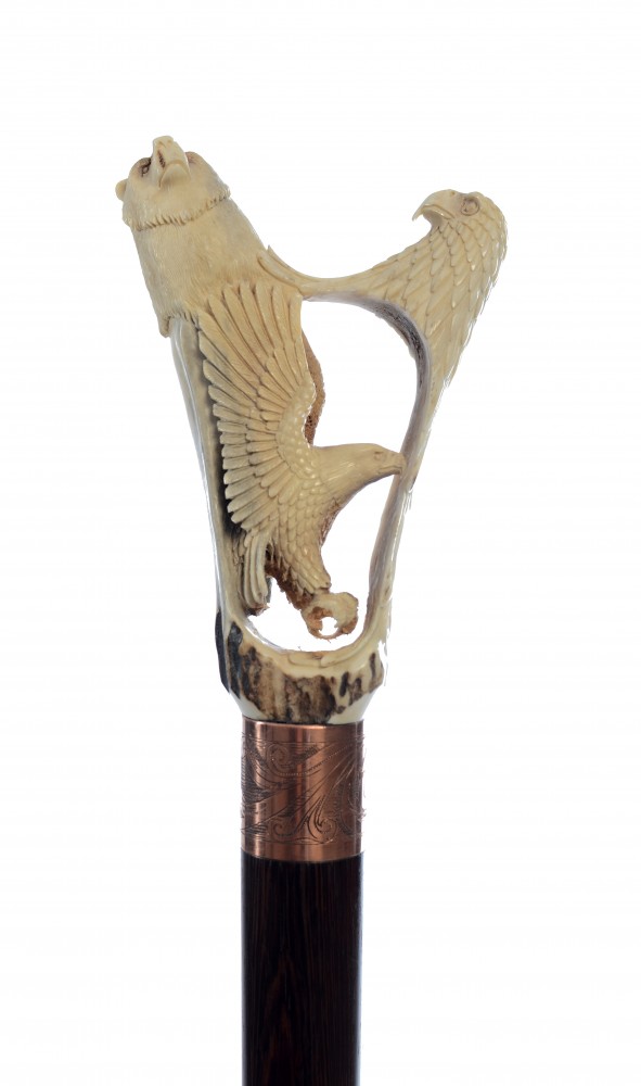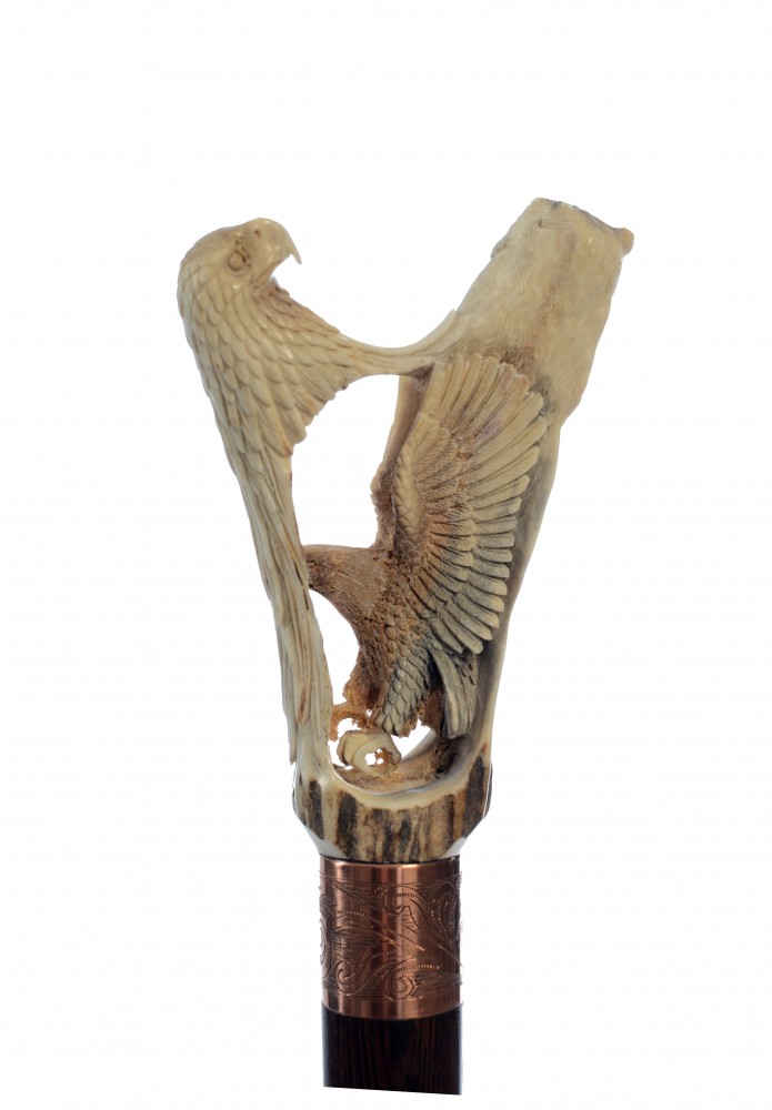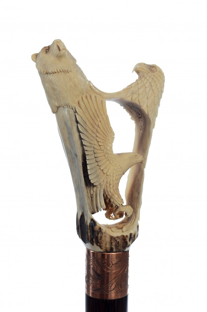 Rukojeť je precizně vyřezávaná a zobrazuje hlavu orla, medvěda a uprostřed je vyřezaný orel ve vzletu.