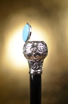 Novinka: Sběratelská vycházková hůl s tepanou postříbřenou rukojetí, světle modrým kamínkem pod kterým je ukryta skrývka na malé drobnosti.