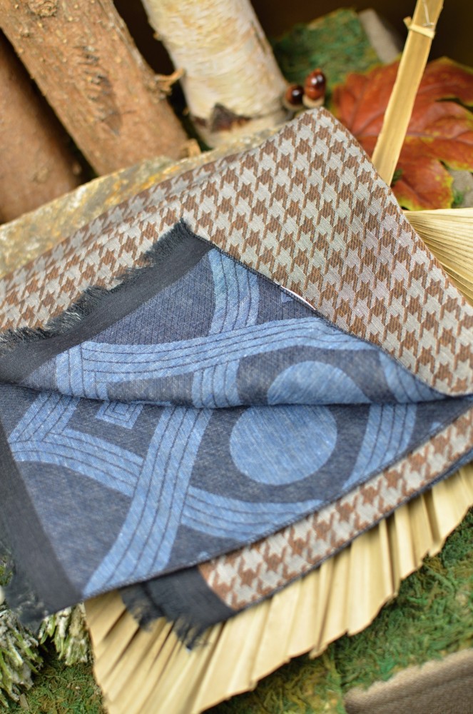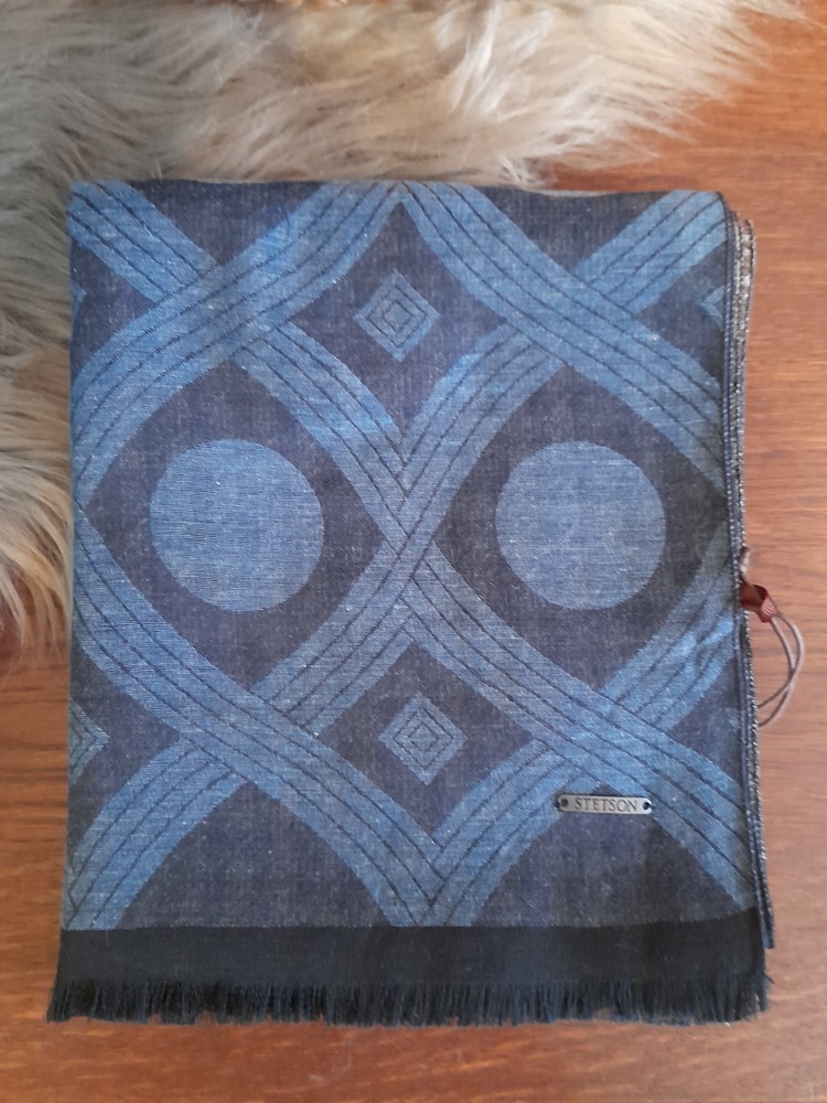 Na omak velmi jemný šátek s decentním geometrickým vzorem v tónech modré. V rubu kohoutí stopa. Vhodné pro dámy i pro pány. Od významné americké značky Stetson.
