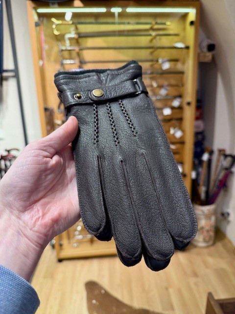 Krásné zimní kožené rukavice v temně hnědé barvě s vnitřní zateplenou podšívkou.