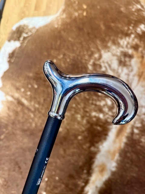 Vycházková hůl s pochromovanou rukojetí a nastavitelnou délkou. Hůlka má černé tělo a elegantně stříbrnou.