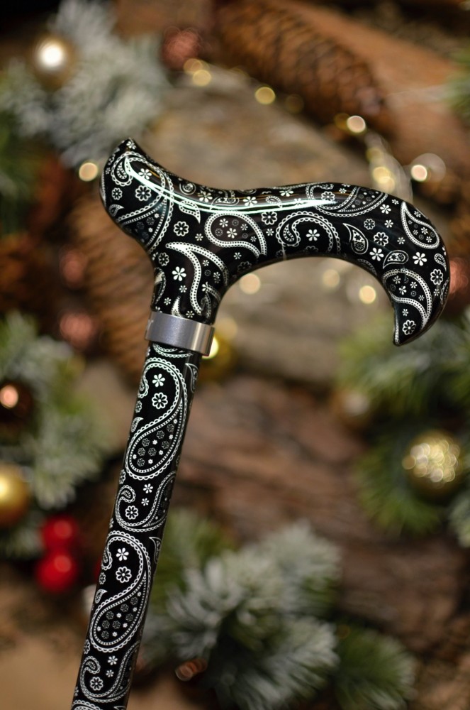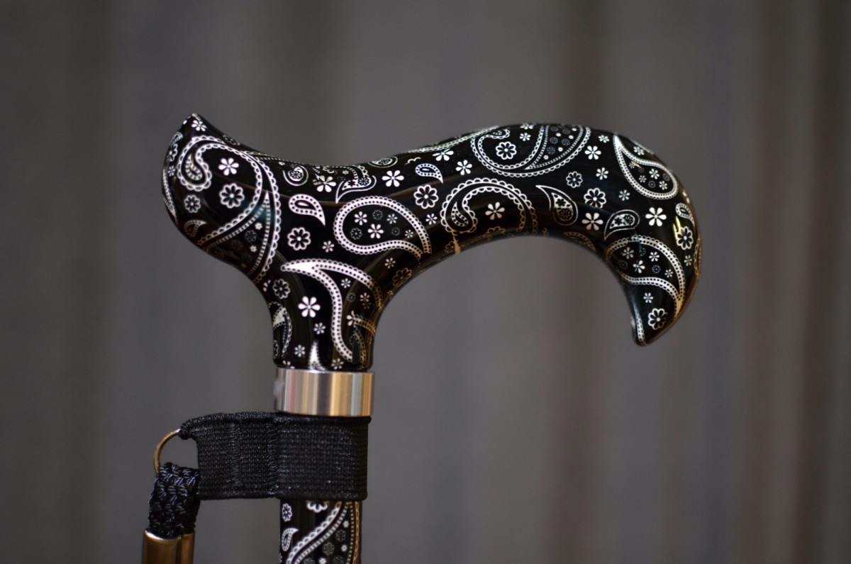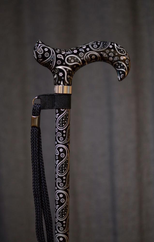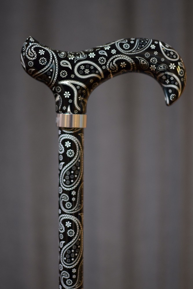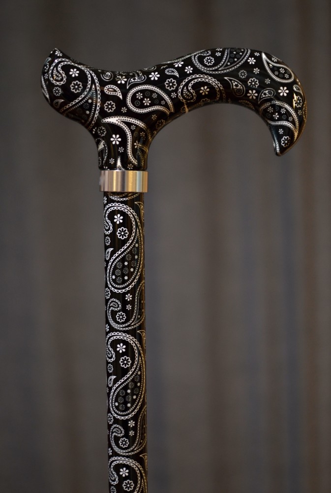 Vycházková hůl s nastavitelnou délkou s rukojetí Derby. Hůl má neutrální černobílý design s jemným zdobením - Paisley vzory. Hůl je lehká a velmi pevná, nastavení délky hole funguje na jednoduchém mechanismu přepnout a došroubovat, hůl je tímto mechanismem bezpečně držena na správné délce. Součástí je textilní poutko. Hůl má mírně zvýšenou nosnost do 110 kg.