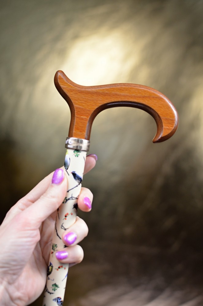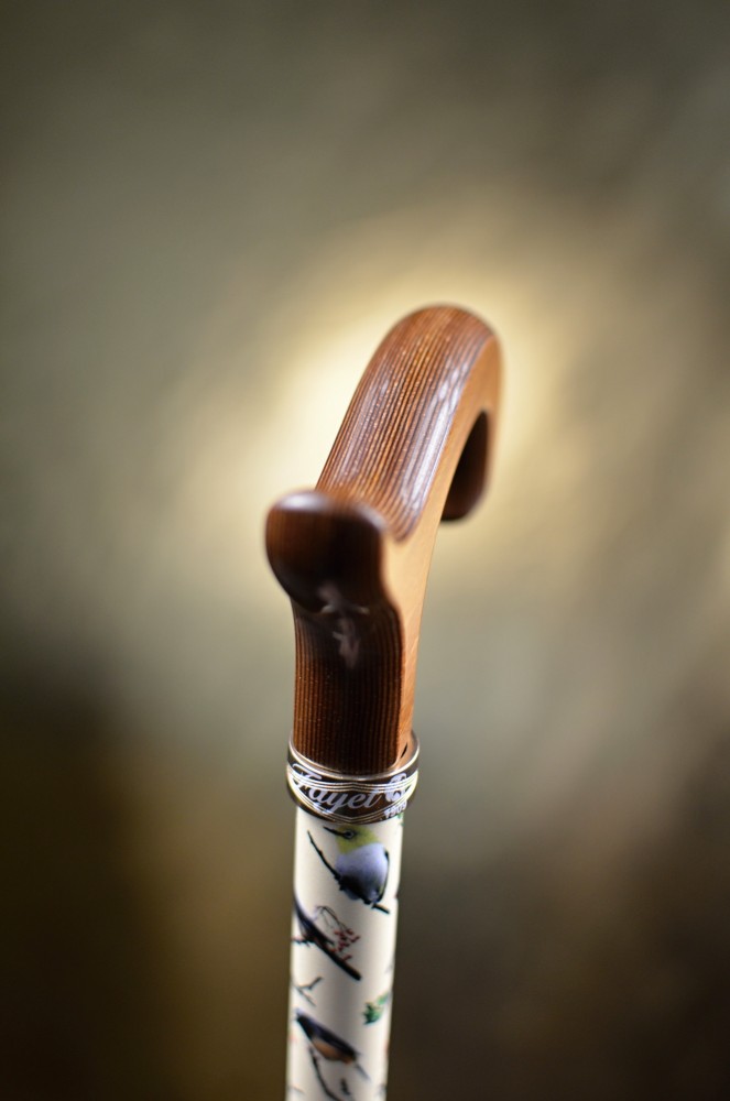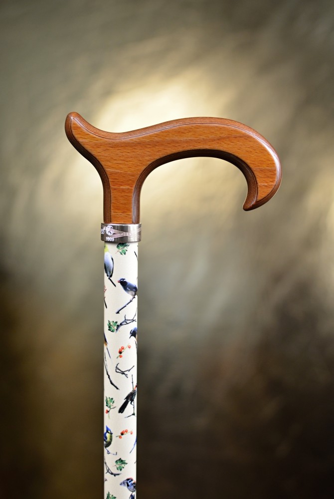 Vycházková hůl značky Fayet s nastavitelnou délkou s rukojetí derby, kterou zdobí ilustrace drobných ptáčků na větvičkách. Hůl je lehká a velmi pevná, nastavení délky hole funguje na jednoduchém šroubovacím mechanismu, hůl je tímto mechanismem bezpečně držena na správné délce.