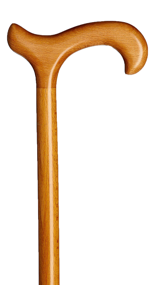 Klasická dřevěná vycházková hůl v hnědé barvě s rukojetí tvaru Derby.
