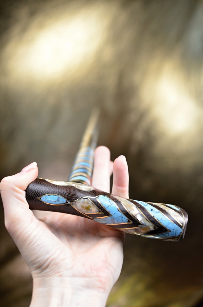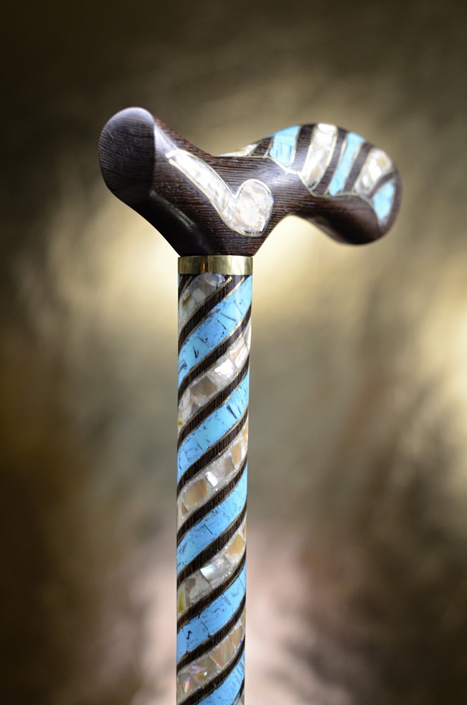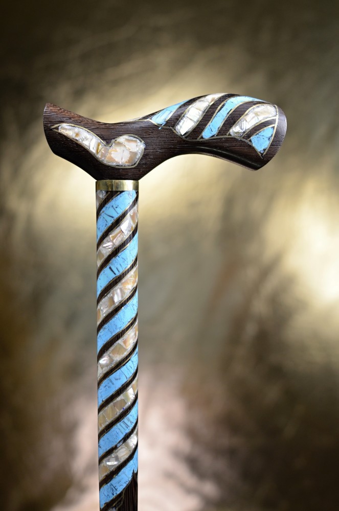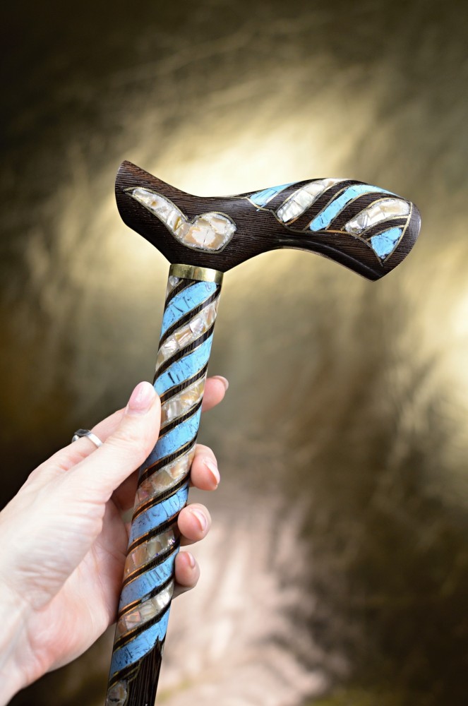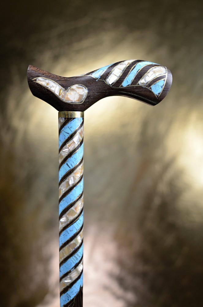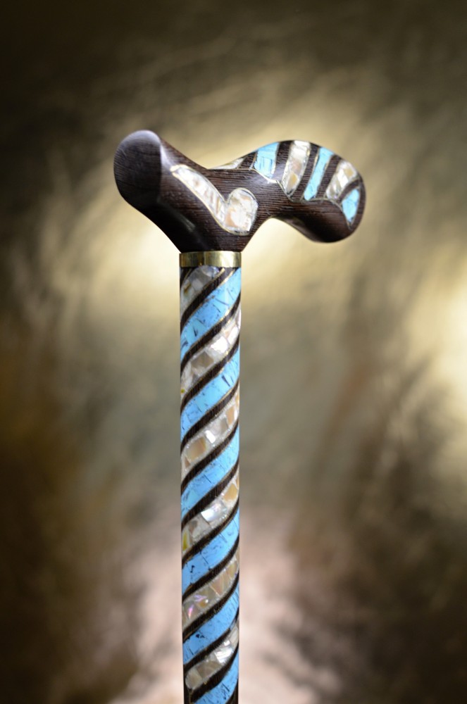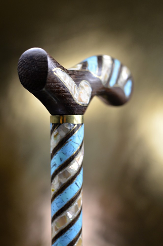 Luxusní vycházková hůl z tmavého ebenového dřeva, zdobená precizní ruční intarzií z pravé perleti (Mother of Pearl Inlay). Každý kousek perleti je pečlivě vsazen do dřeva, což vytváří jemný, ale výrazný třpyt a jedinečný orientální charakter.