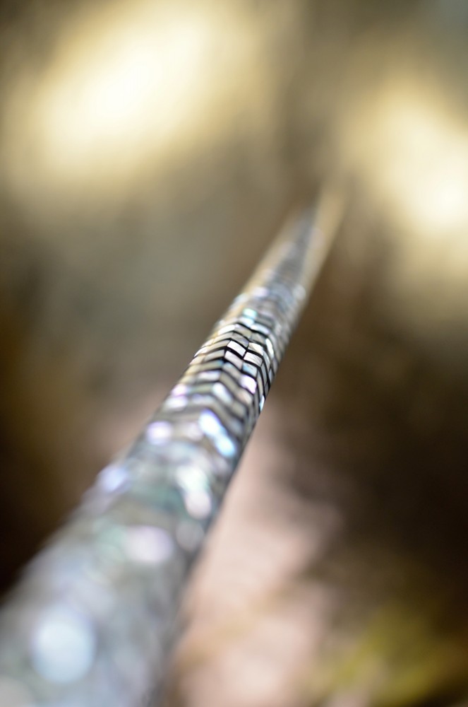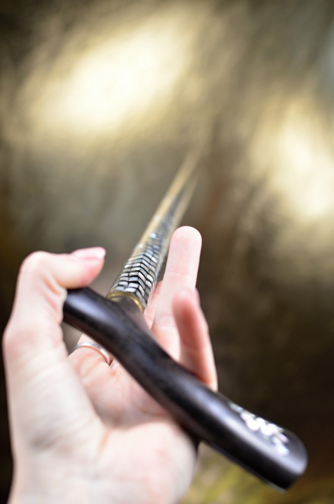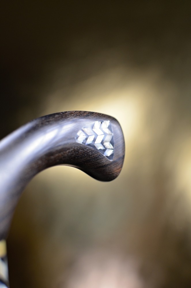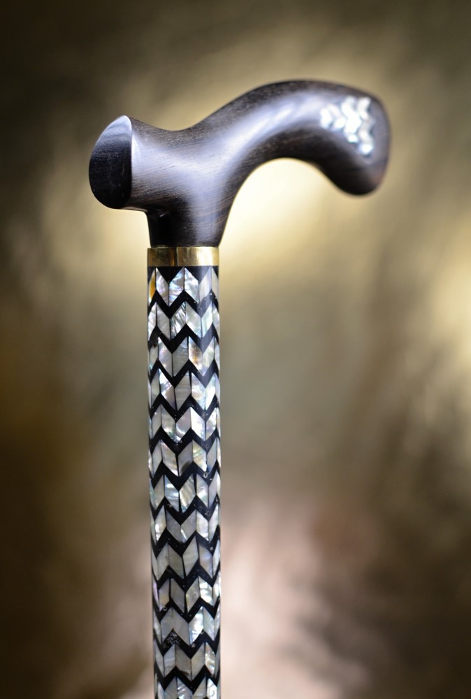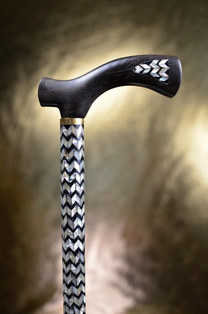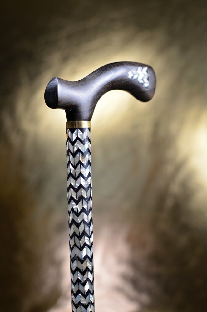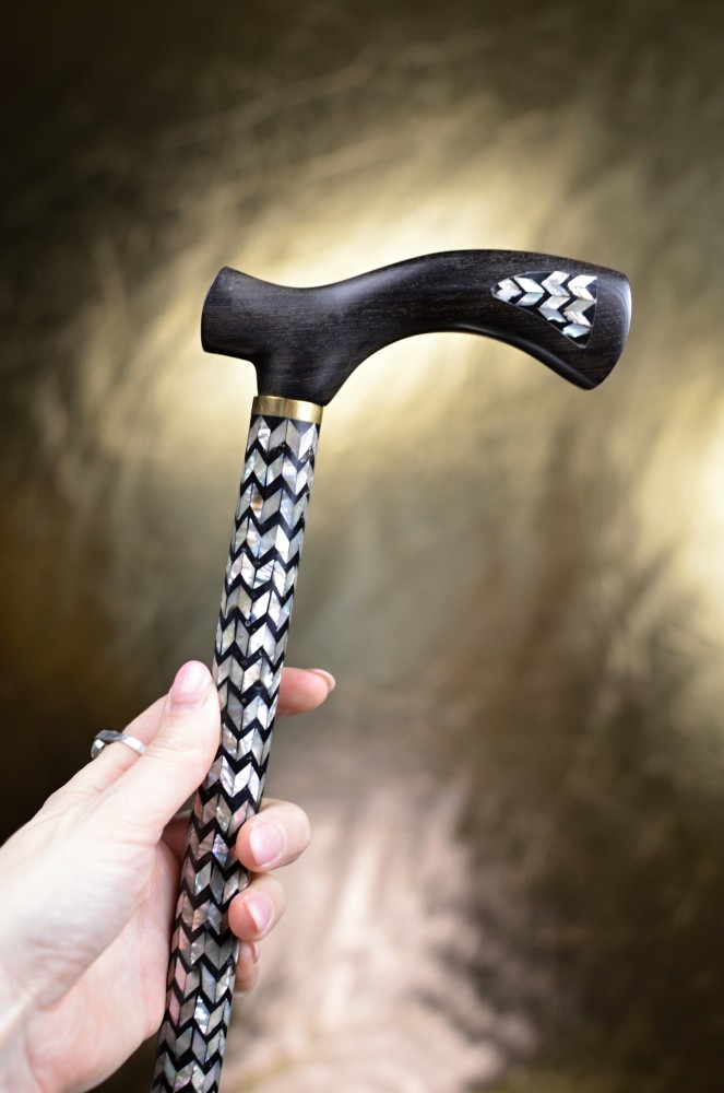 Luxusní vycházková hůl z tmavého ebenového dřeva, zdobená precizní ruční intarzií z pravé perleti (Mother of Pearl Inlay). Každý kousek perleti je pečlivě vsazen do dřeva, což vytváří jemný, ale výrazný třpyt a jedinečný orientální charakter.
