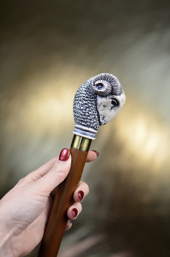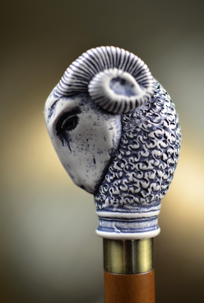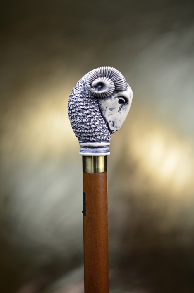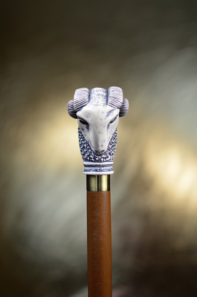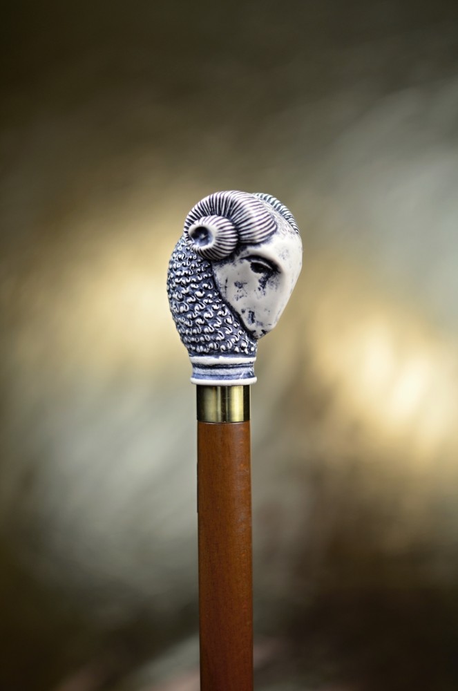 Sběratelská vycházková hůl s rukojetí ve tvaru hlavy berana.