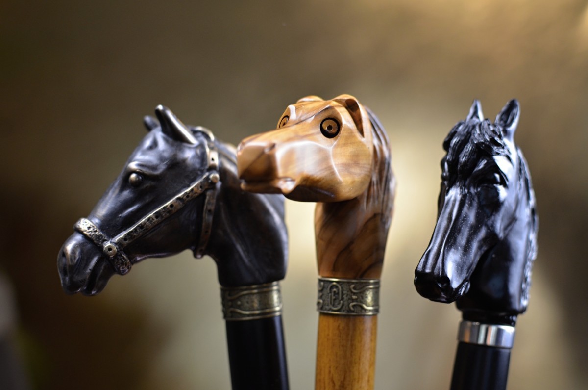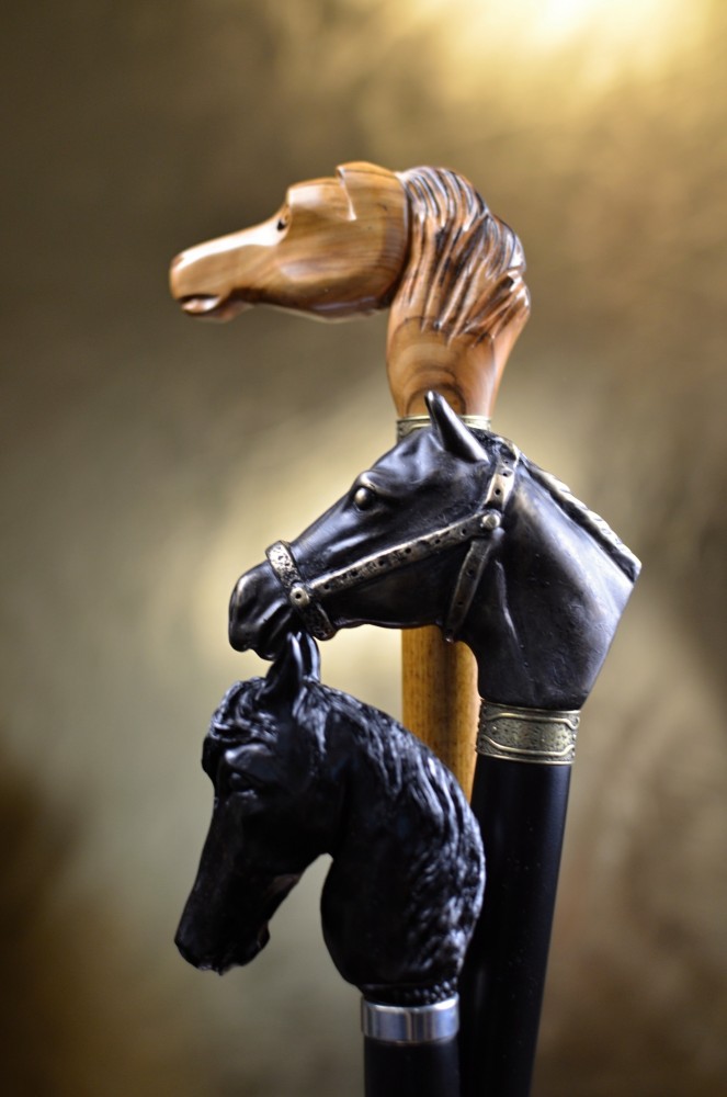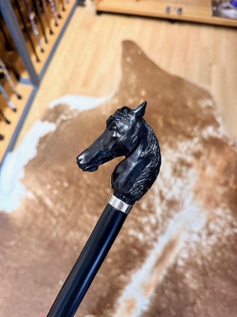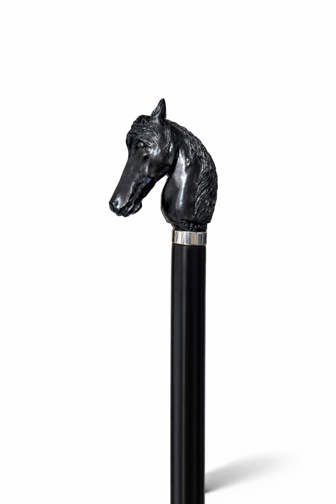 Sběratelská vycházková hůl s luxusně zpracovanou rukojetí ve tvaru hlavy koně, vyřezávanou ručně z ebenového dřeva. Tělo hole je vyrobeno z bukového dřeva a laděno do elegantní černé barvy. Celek doplňuje kovový prstenec pod rukojetí, který podtrhuje její reprezentativní a sběratelský charakter.