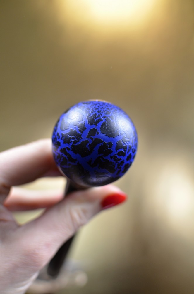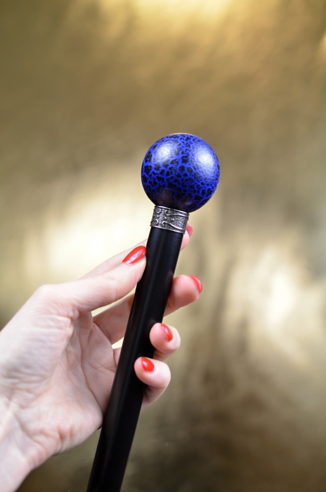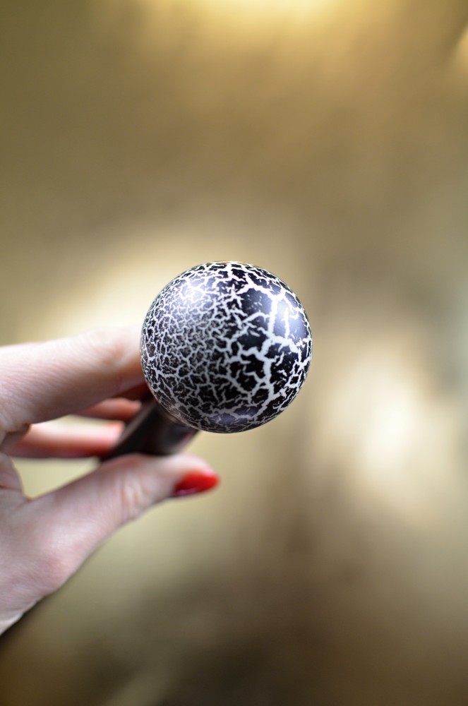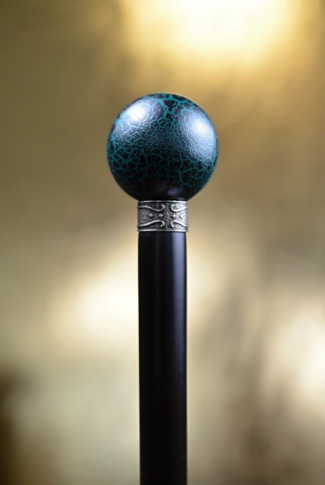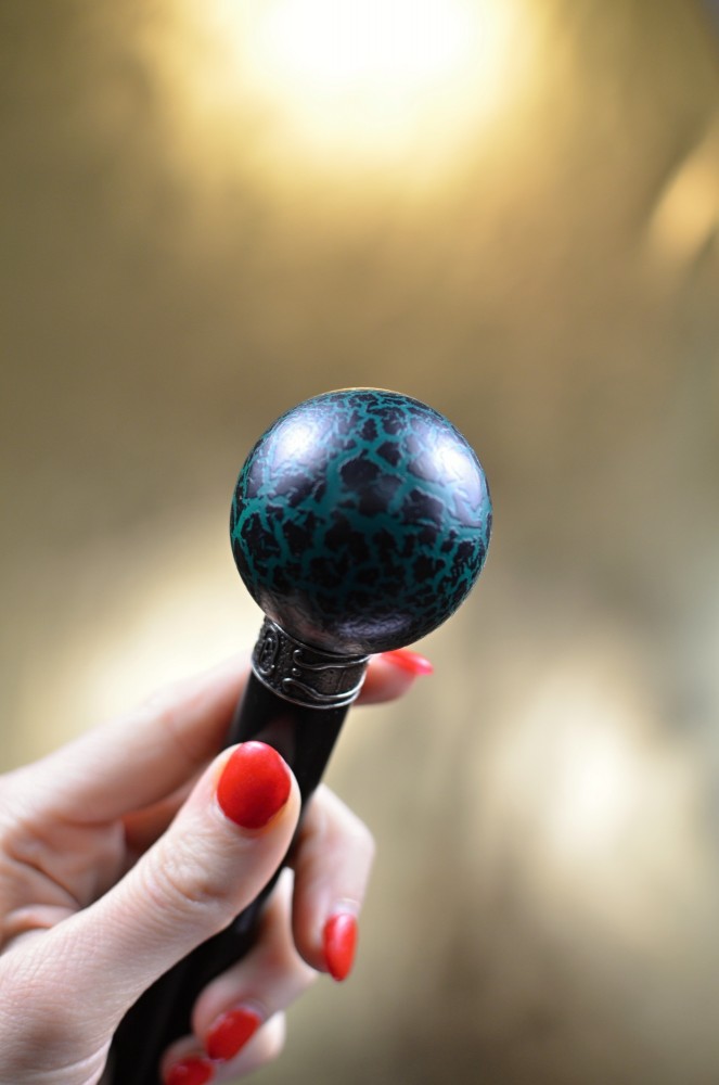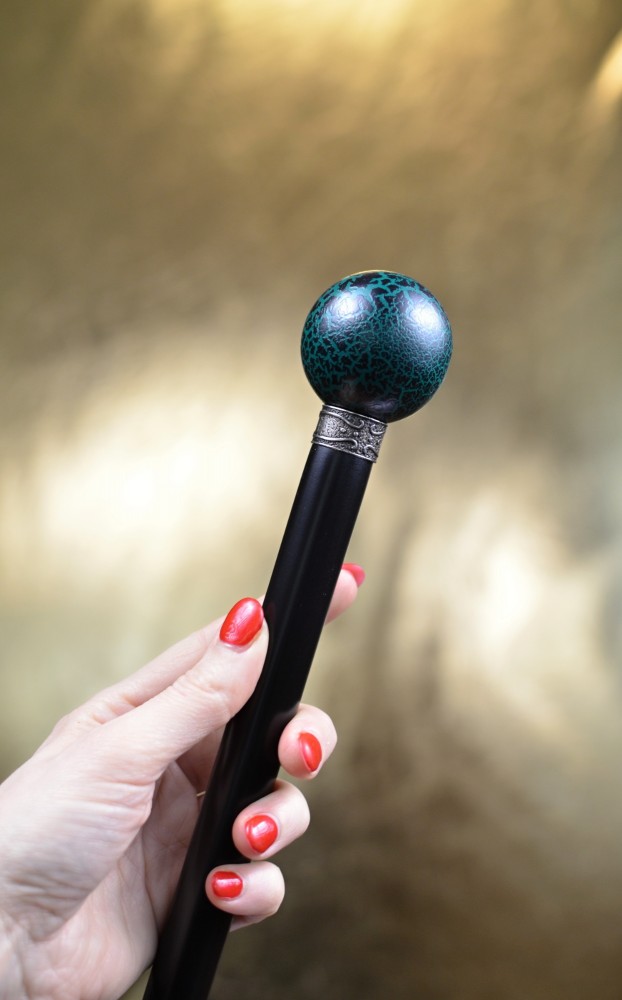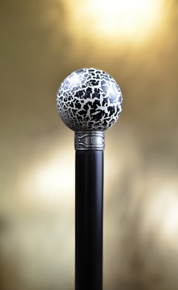 Sběratelská vycházková hůl s kulatou rukojetí, zdobenou efektem „cracking“ – záměrně popraskaným povrchem, který vytváří nevšední a originální vzhled.