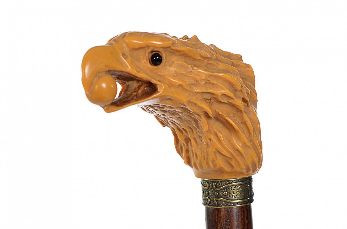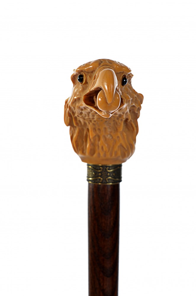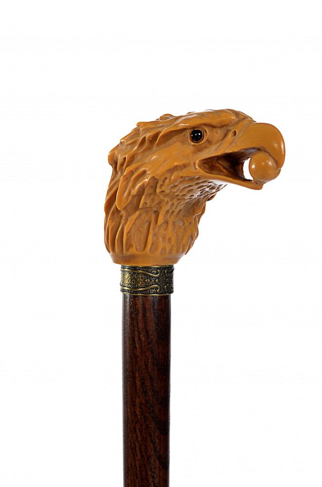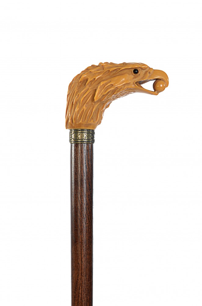 Sběratelská vycházková hůl s rukojetí ve tvaru hlavy orla, který v zobáku drží kuličku. Precizní práce a unikátní kousek.