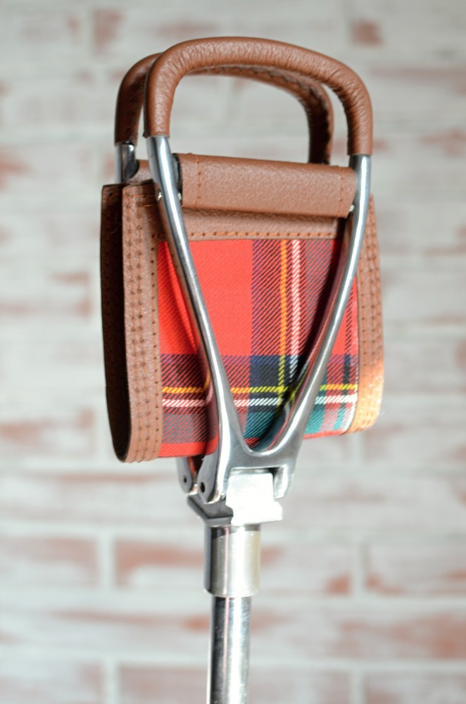 Sedátko je z koženky a spodní část sedačky je v kára vzoru. Držadla jsou obšita z kůže.