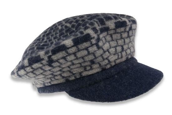 Vlněný baret se vzory a pevným kšiltem. Látka je tlustá a pevná.