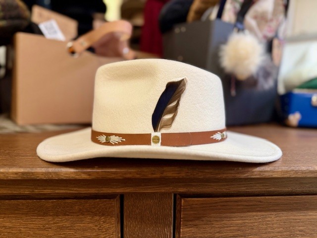 Naprosto krásný klobouk bílé barvy s jemně zahlou krempou směrem nahoru, koženým ozdobným páskem a bílým vyšíváním.